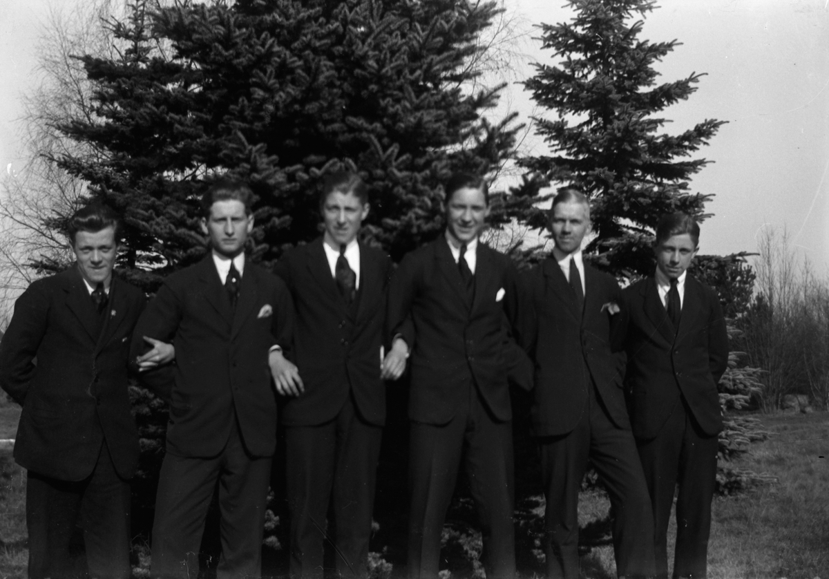 Sex män står uppställda framför några granar.