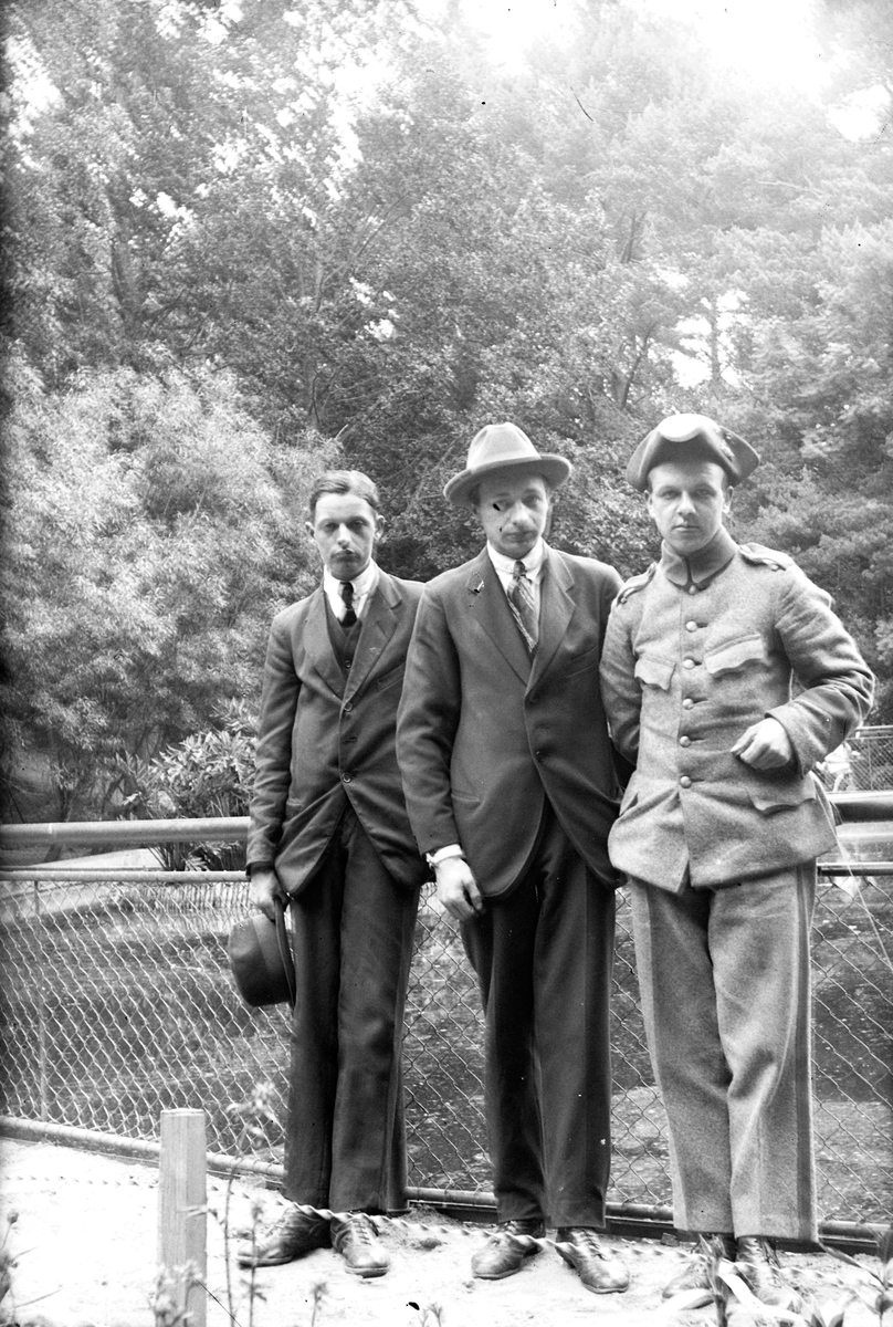Tre män, Gustav Andersson (2), står vid ett stängsel med lövträd och buskar i bakgrunden. Mannen till höger är klädd i soldatuniform.