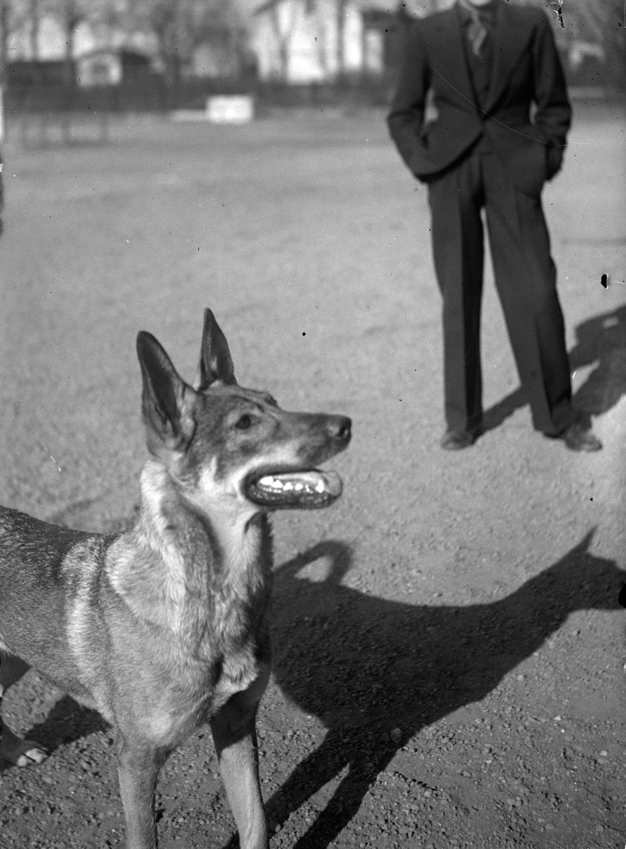 Titel: En hund, troligen schäfer, står på en grusplan och tittar uppåt. I bakgrunden står en man.