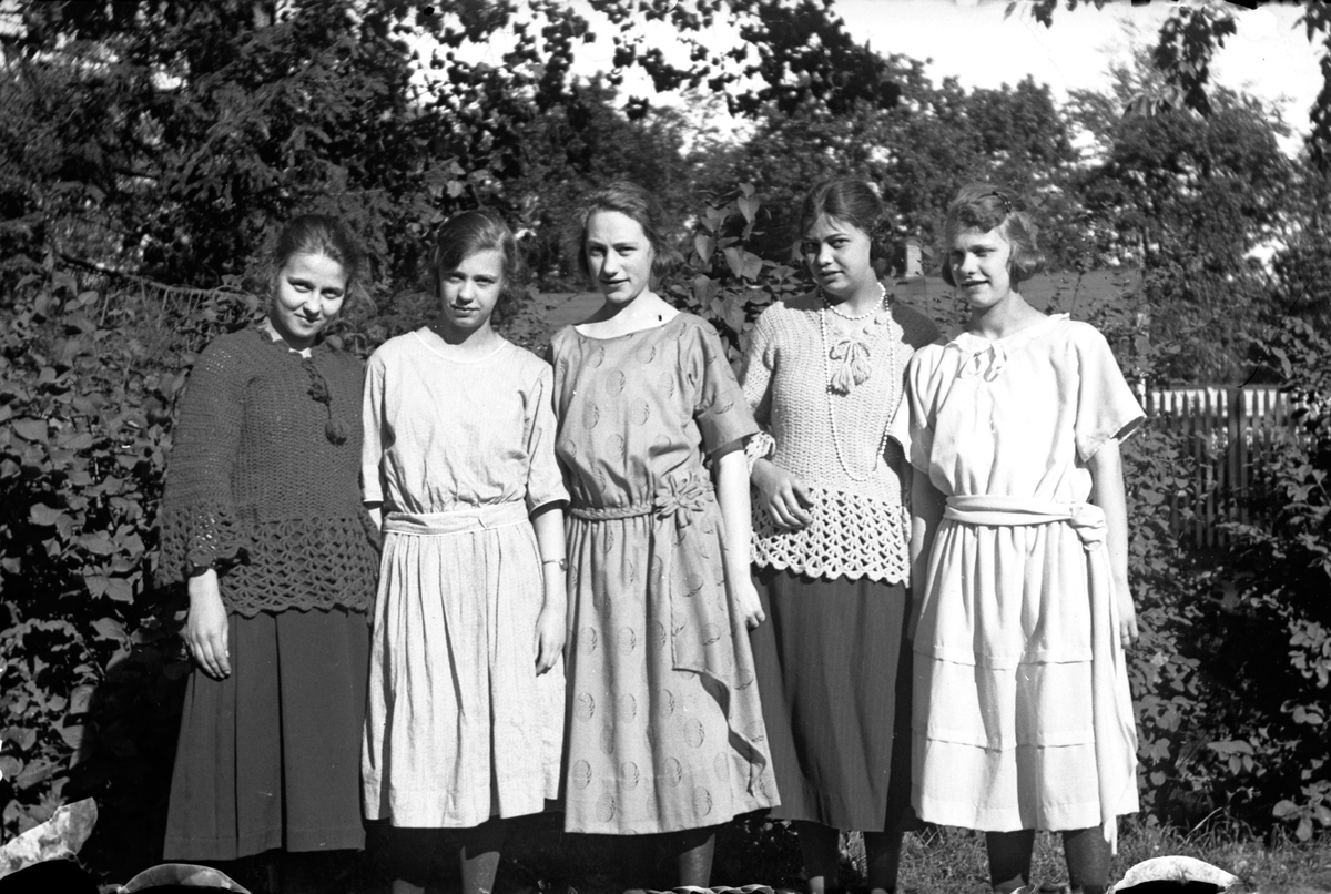 Fem unga kvinnor står i en trädgård framför ett staket, i bakgrunden skymtar ett hustak mellan träden.