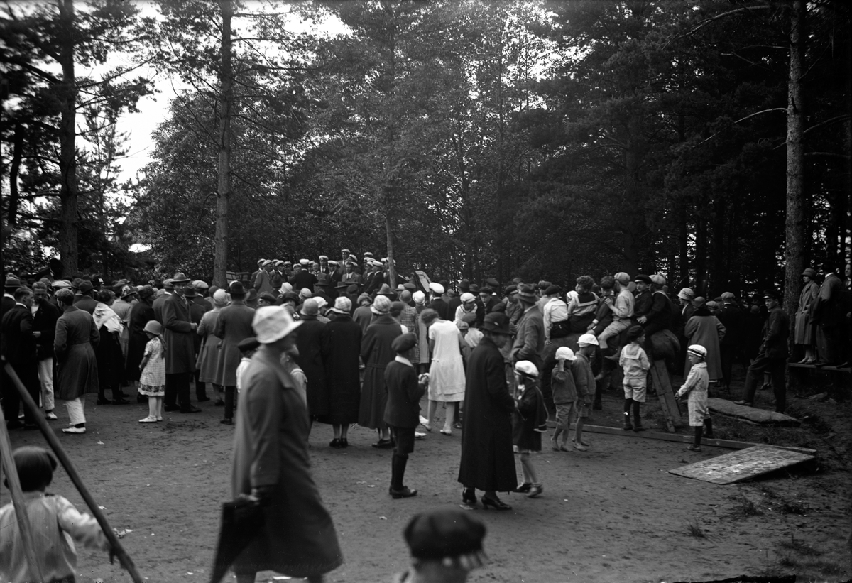 Ett stort antal människor har samlats för att lyssna på en manskör som är klädda i studentmössor.