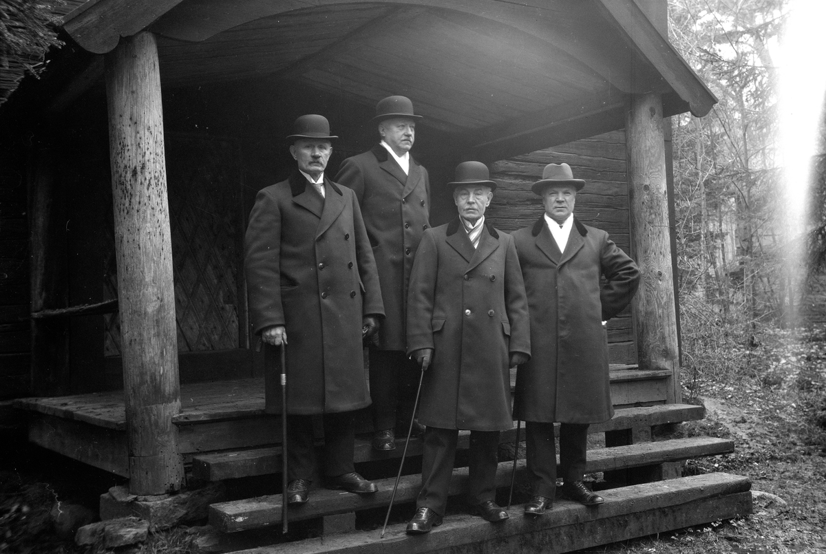 Fyra män på trappan till Sockenmagasinet i Jönköpings stadspark. Gustav Anderssons far (2).
