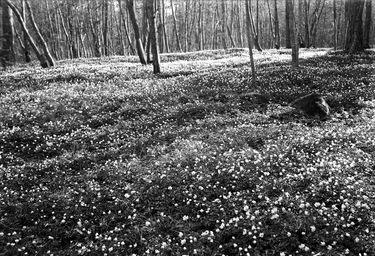 En skogsbacke med lövträd och marken täckt med vitsippor.