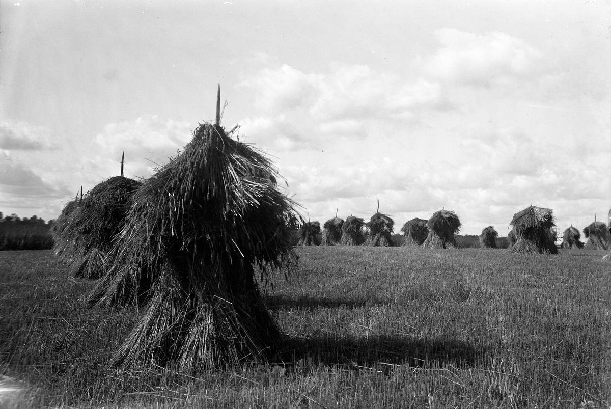 Titel: Ett fält med rader av sädesskylar.
