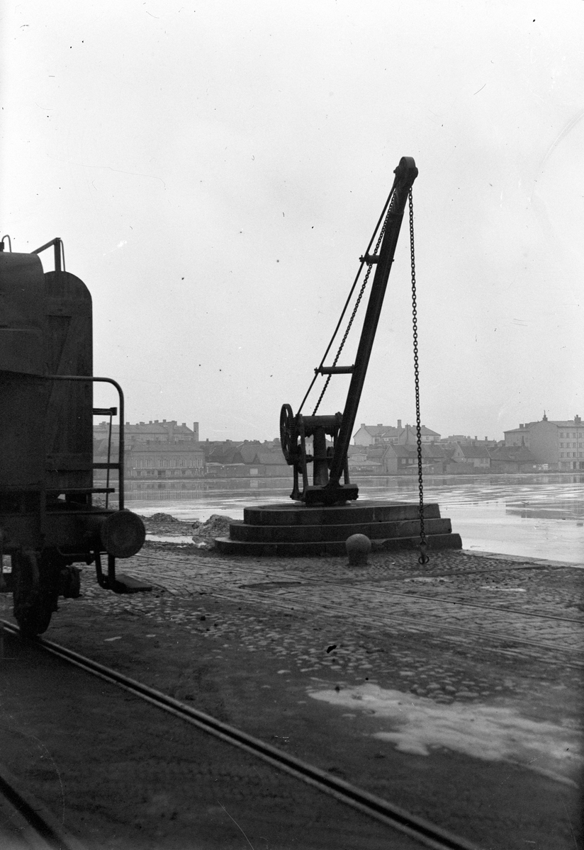 En kran på kajen vid Munksjön, Jönköpings inre hamn. I bakgrunden syns stadsdelen "öster".