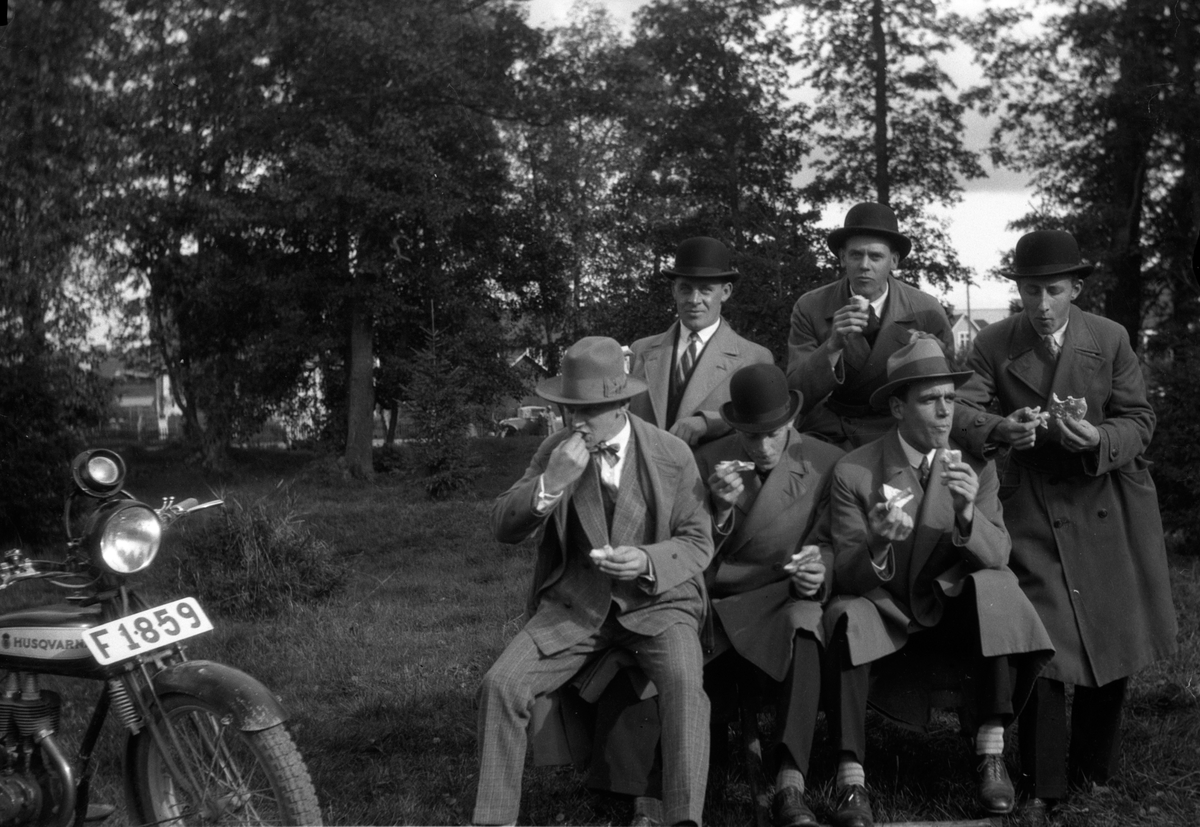 Några män från föreningen Tord tar matpaus och de äter kokt korv i papper och bröd i andra handen. Till höger sitter Einar Svensson och i mitten upptill står "Nisse Falköping". En Husqvarna motorcykel står parkerad bredvid dem.