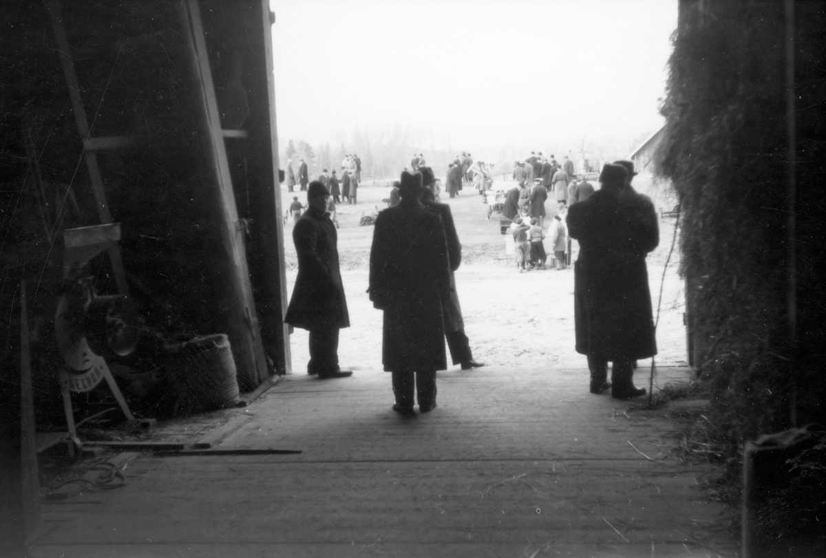Några män i en lada tittar ut på gården där människor studerar utställda föremål, kanske en auktion.