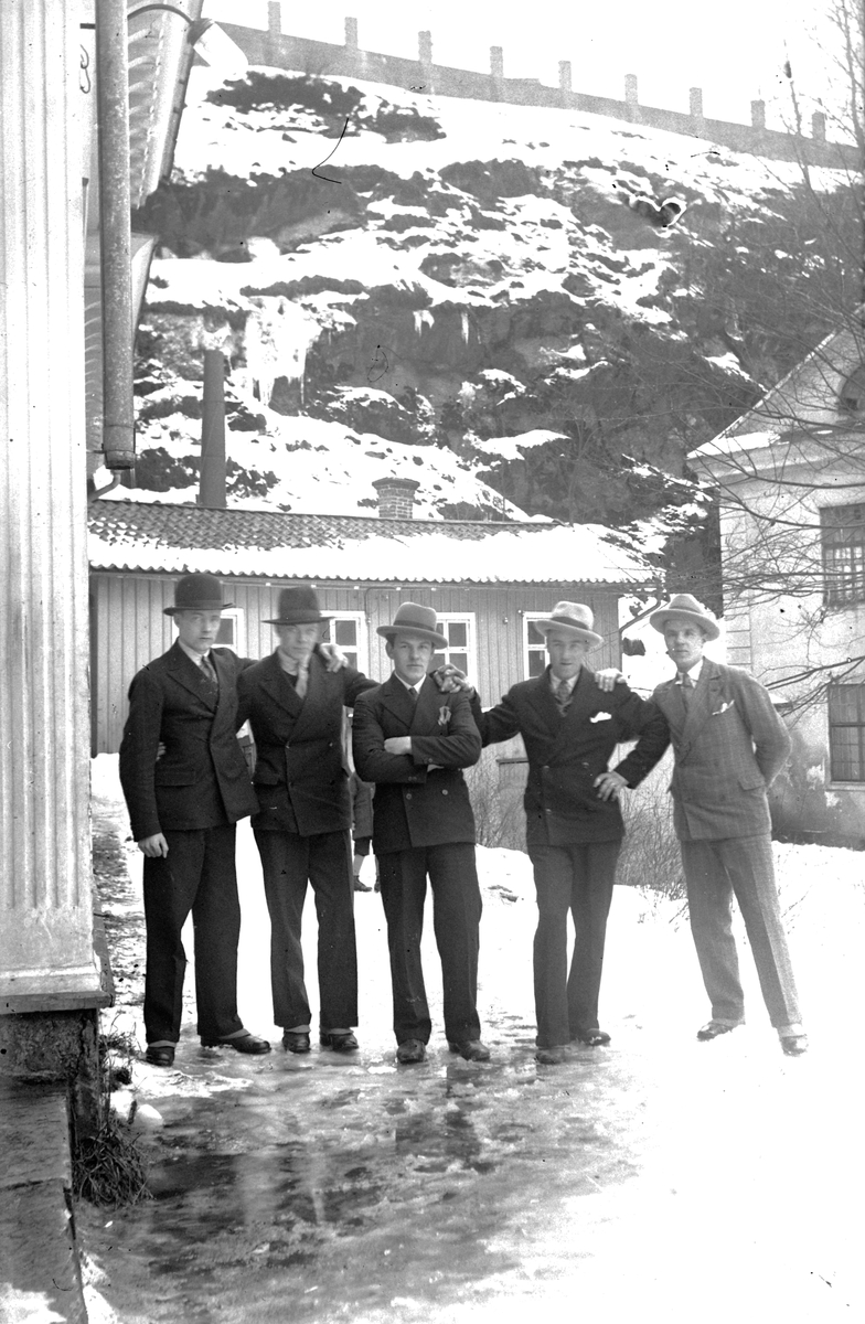 Fem män står framför ett lågt trähus, i bakgrunden en brant bergvägg.