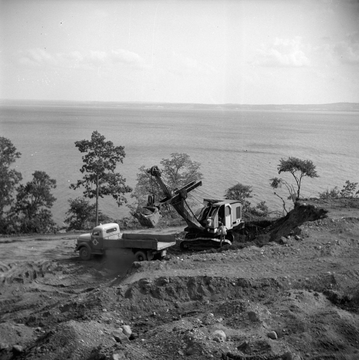 Motorvägen från Jönköping norrut, här schaktas med grävmaskin och lastbil vid Vista kulle 1958. Den nya sträckningen var klar 1960.
