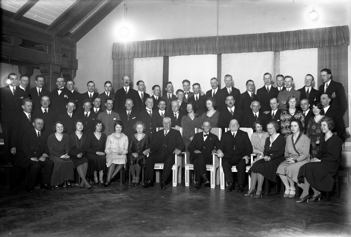 Gruppbild på män och kvinnor i en samlingslokal.