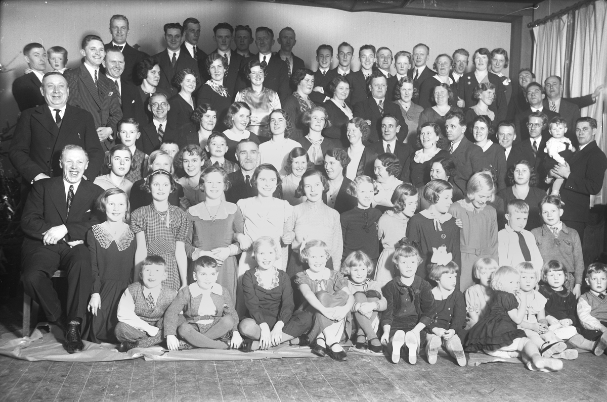 En gruppbild på män, kvinnor och barn i en samlingslokal.