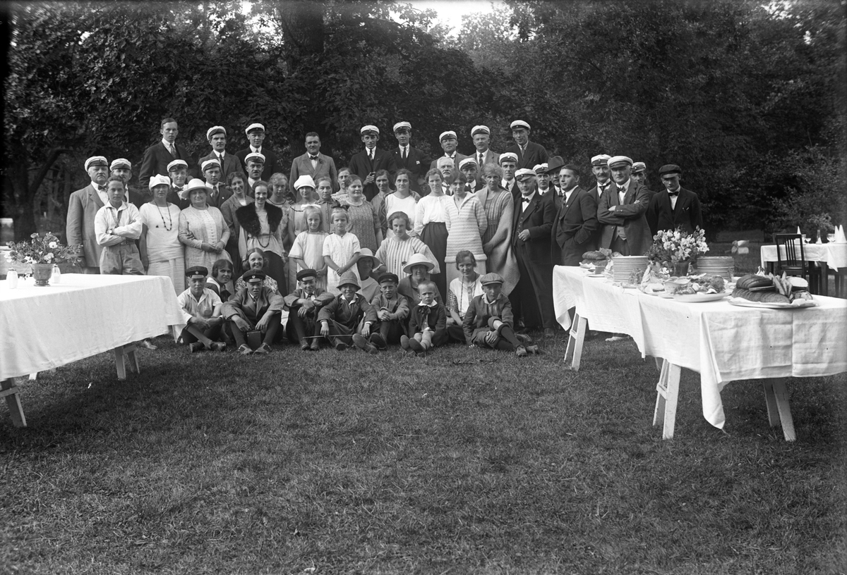 En gruppbild på Orfeus Körsällskap med familjer. Långbord med mat och dryck är framdukat på gräset. I bakre raden: Mats Bergling (1), Helge Ottosson (5), Åke Axelsson (6), Karl Bergling (9). Mellersta raden: August Andersson (1). Främre raden: Karl-Erik Bergling (3), Karin Widegren (4), Frej Ottosson (10), Gösta Bergling (13),