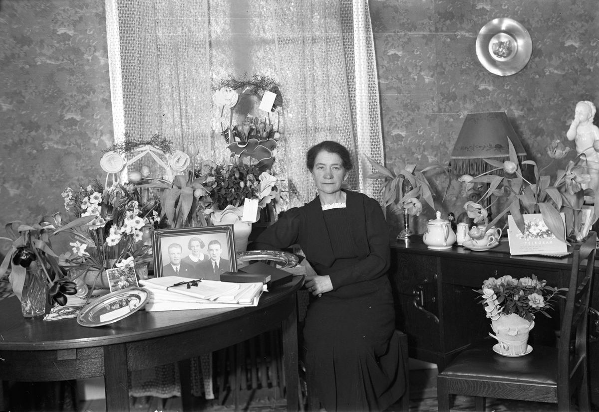 Högtidsdagen firas. Blommor och lyckönskningar är arrangerade runt omkring.