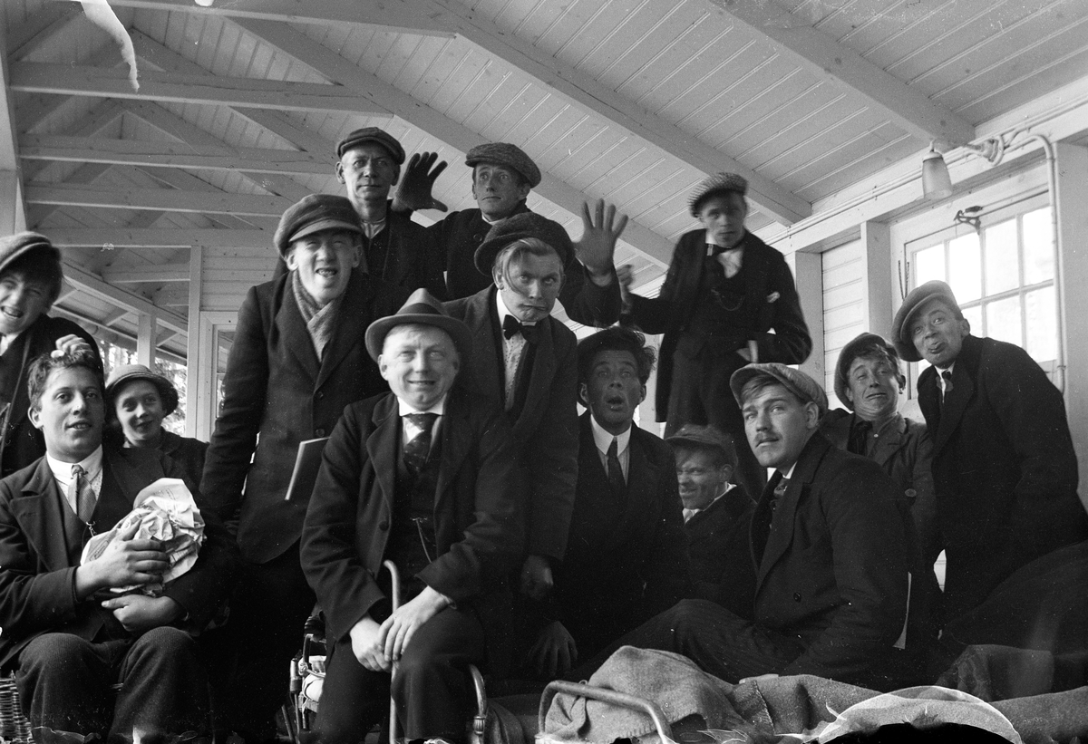Tretton män och en kvinna vid ett par sängar i de öppna ligghallarna på Lungkliniken i Eksjö.