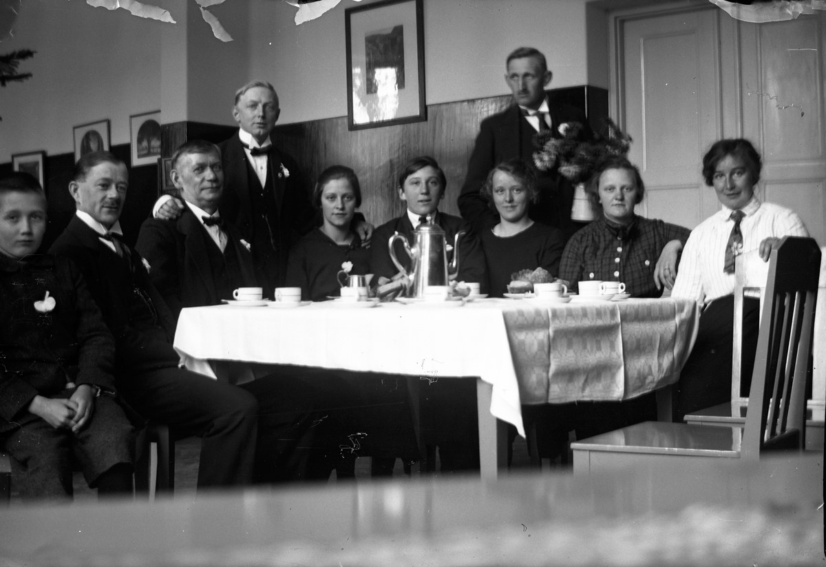 Fem män, fyra kvinnor samt en pojke sitter eller står vid ett kaffebord, i bakgrunden fyra tavlor samt dörrar. Lungkliniken i Eksjö.