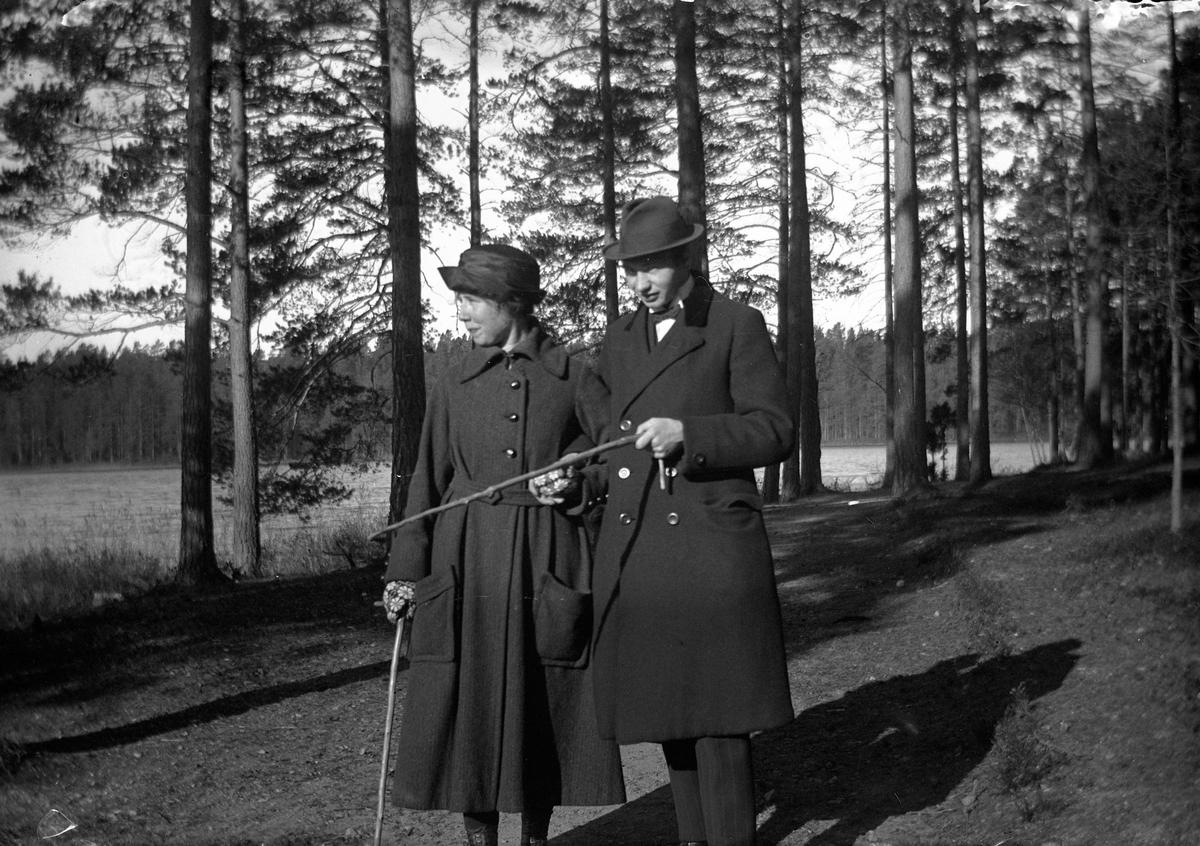 En man och en kvinna går arm i arm, båda med käppar, vid sjön i barrskogen vid Lungkliniken i Eksjö.