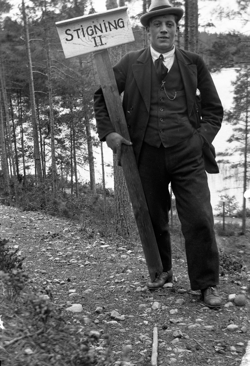 En man står på en stig i barrskogen vid Lungkliniken i Eksjö. Han håller i en skylt med texten: STIGNING II.