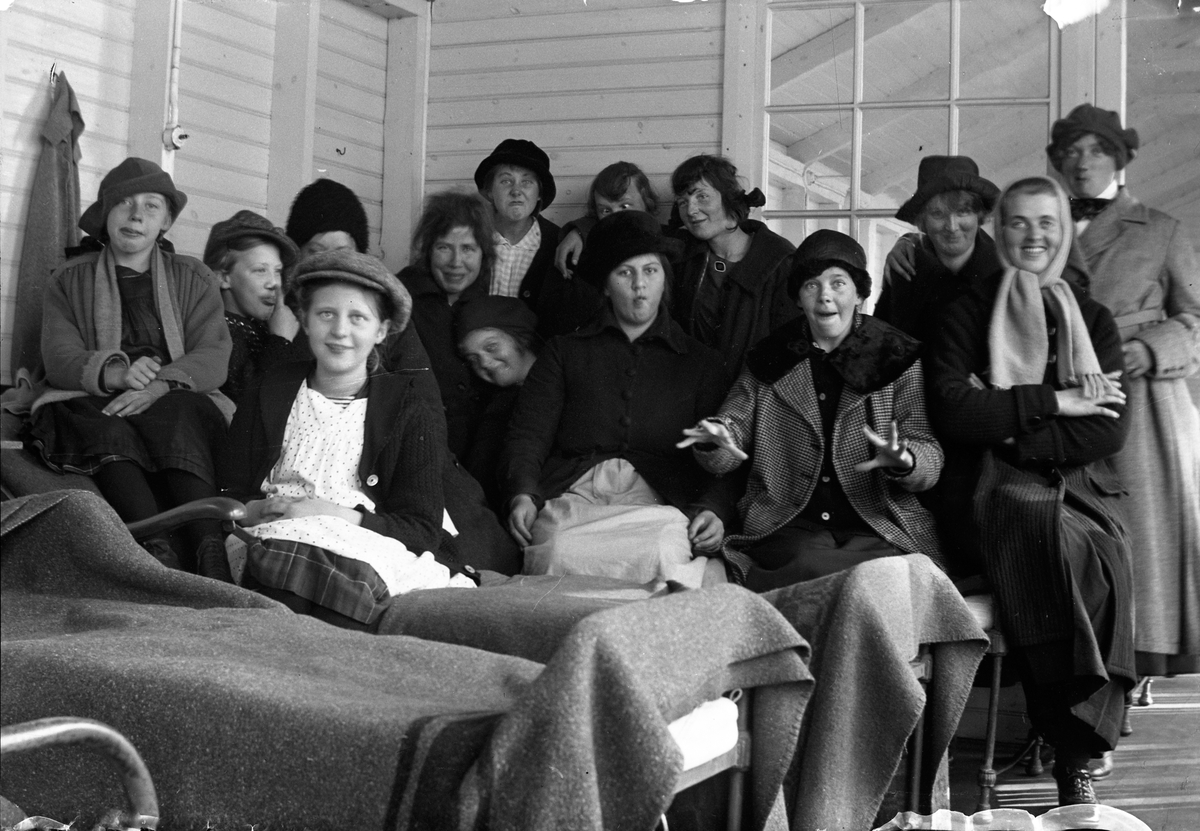 Fjorton kvinnor står vid eller sitter på en rad sängar, på träverandan vid Lungkliniken i Eksjö.