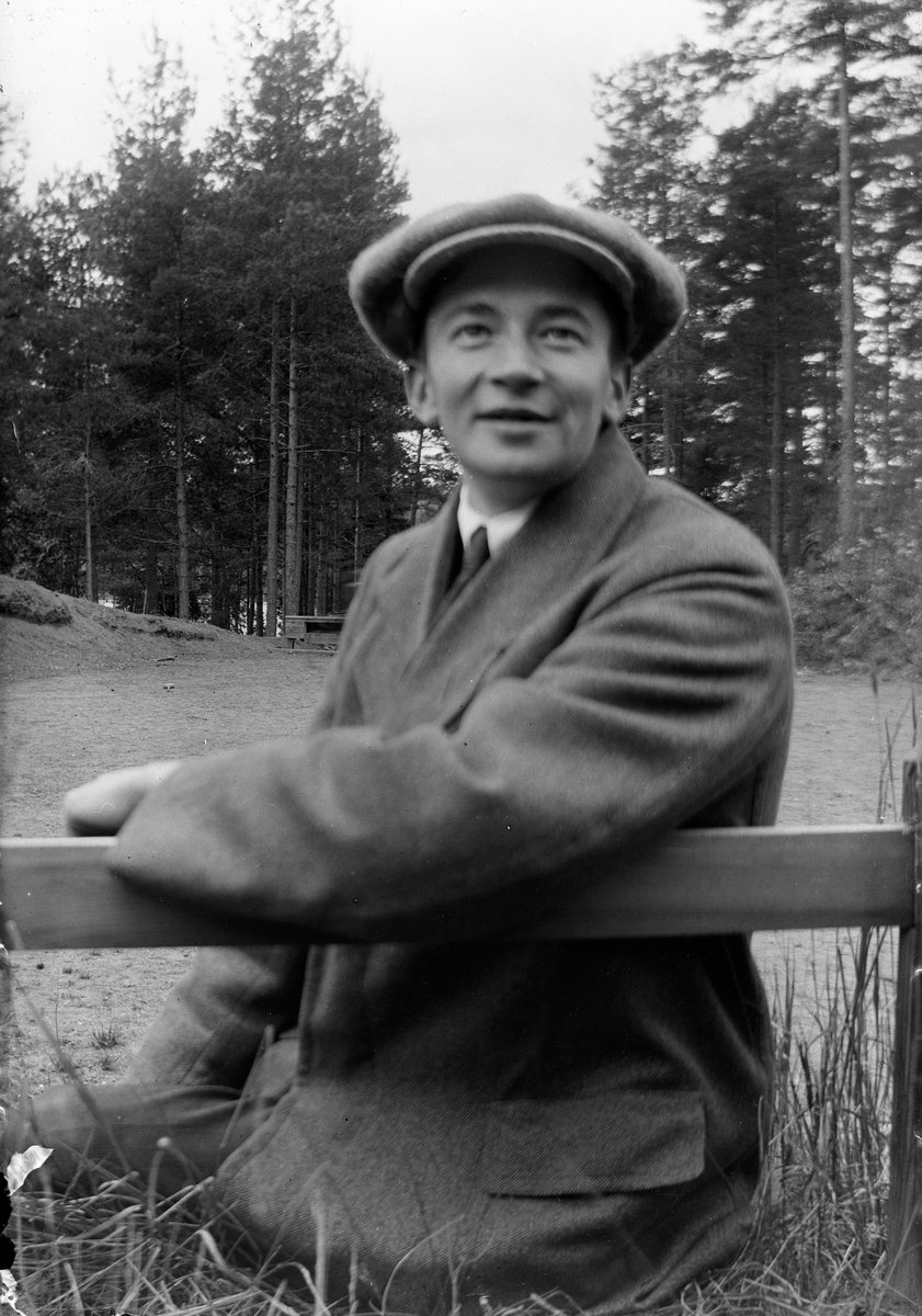 En man i keps sitter med armen stödd mot ett räcke i skogen vid Lungkliniken i Eksjö.
