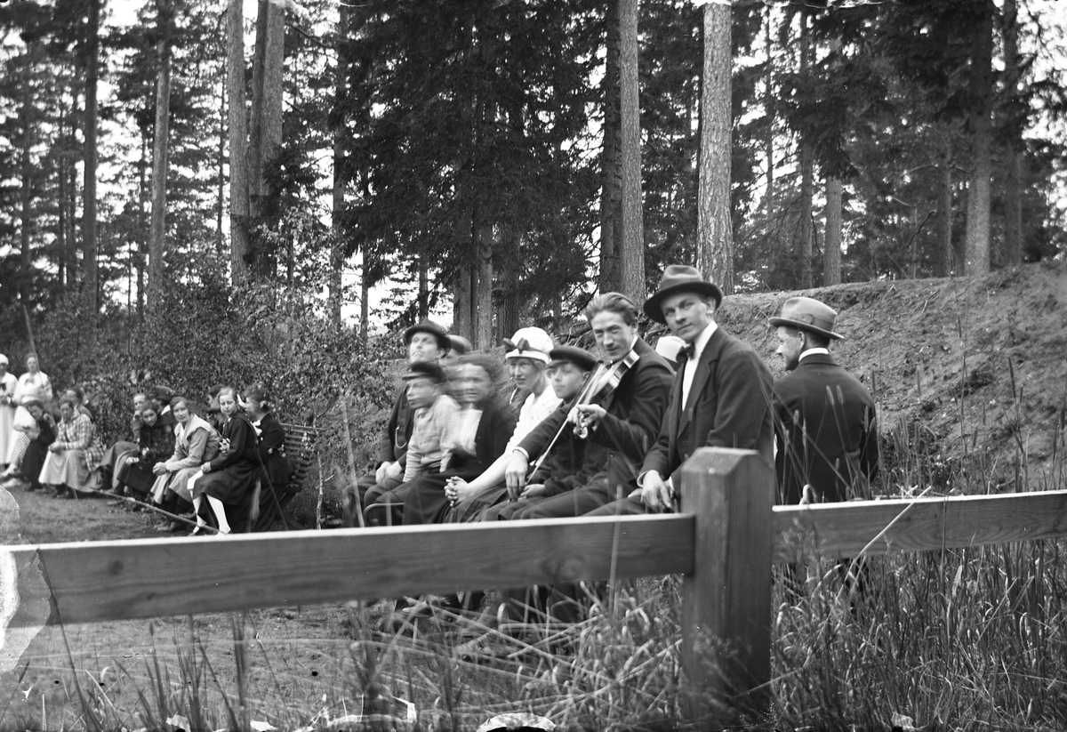 Tio personer sitter på en bänk. I bakgrunden syns ett drygt tiotal personer på bänkar samt barrskog, i förgrunden ett träräcke. Lungkliniken, Eksjö.