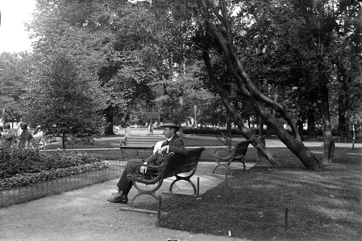 En man sitter på en bänk i Rådhusparken i Jönköping. I omgivningen finns en inhägnad plantering med blommor, stora lövträd, gräsmattor och grusgångar med soffor utplacerade.