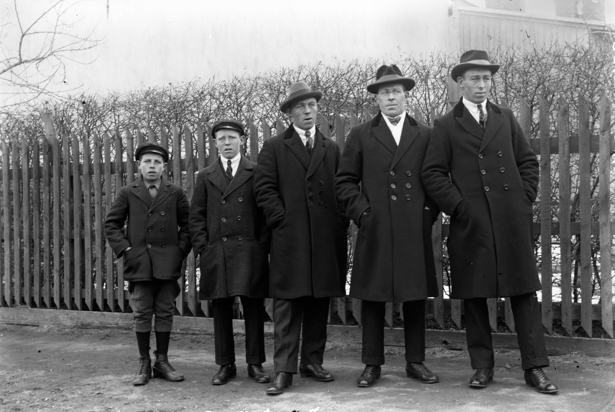 Två pojkar och tre män står på rad i storleksordning framför ett trästaket.