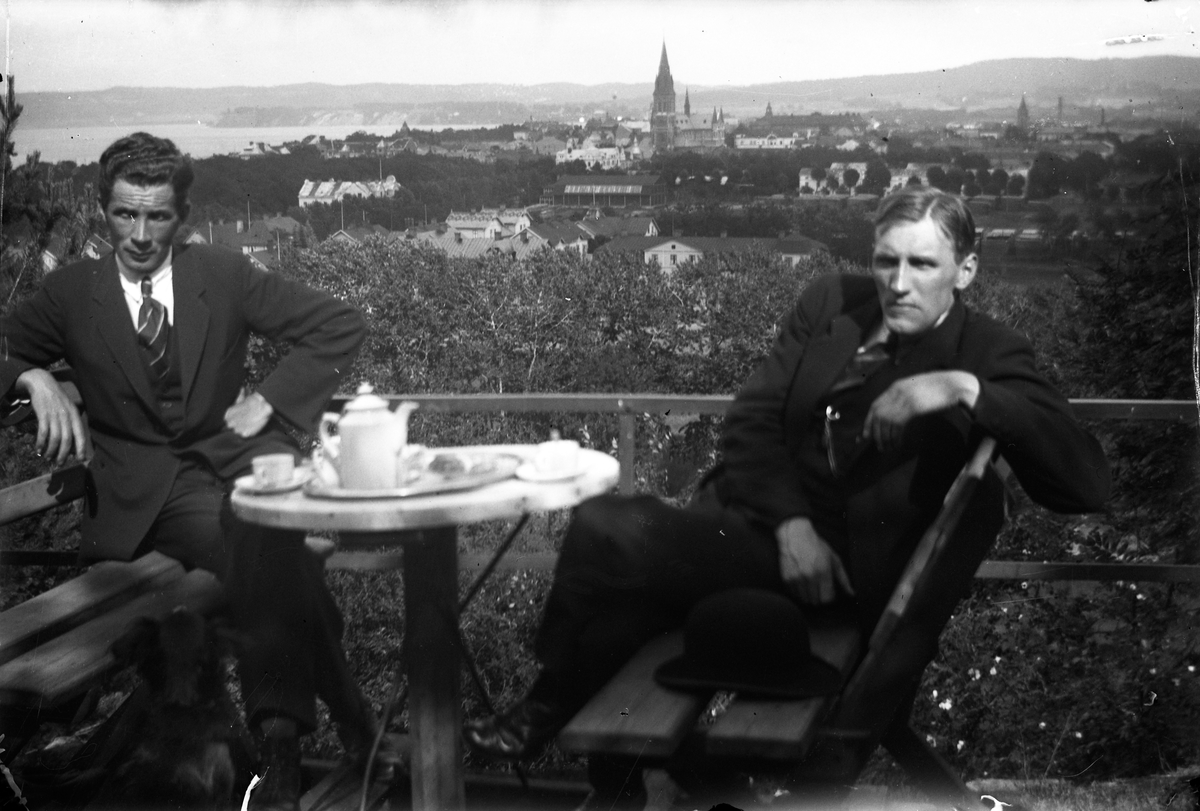 Två män sitter vid en uteservering med utsikt över Jönköping. Bordet är dukat med koppar och fat, på en bricka står bland annat en kaffekanna.