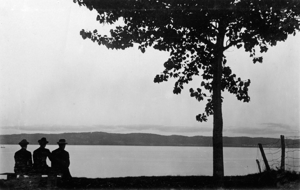 Tre män sitter på en bänk och ser ut över Vätterns vatten med Huskvarna till höger i bakgrunden.