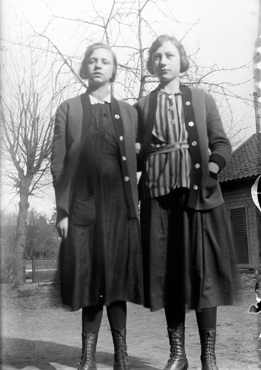 Porträtt av två flickor, i bakgrunden syns ett uthus och staket.