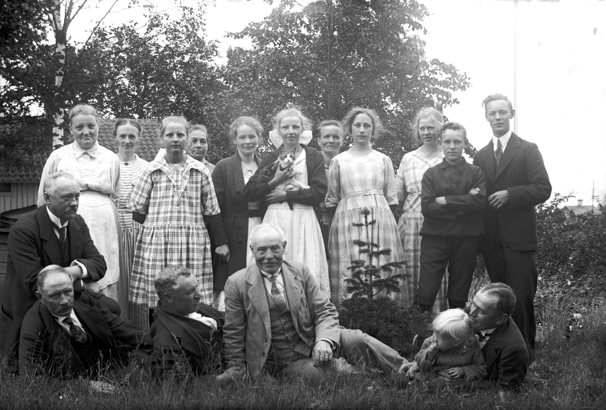 Sjutton personer uppställda för fotografering i gröngräset. I bakgrunden syns träd och en byggnad med tegeltak.