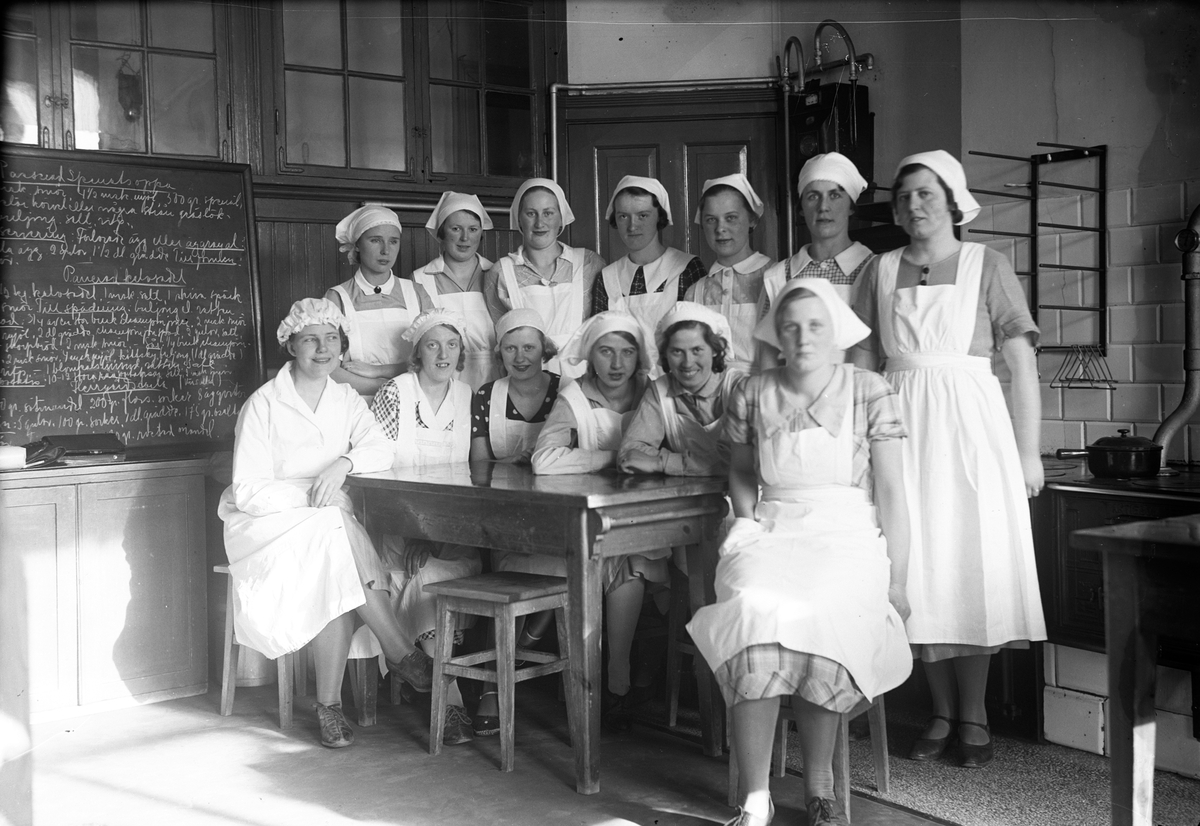 Några elever i ett skolkök i Jönköping, kanske Idas skola. På tavlan till vänster står ingredienserna till bland annat passerad spenatsoppa och panerad kalvsadel med potatis.
