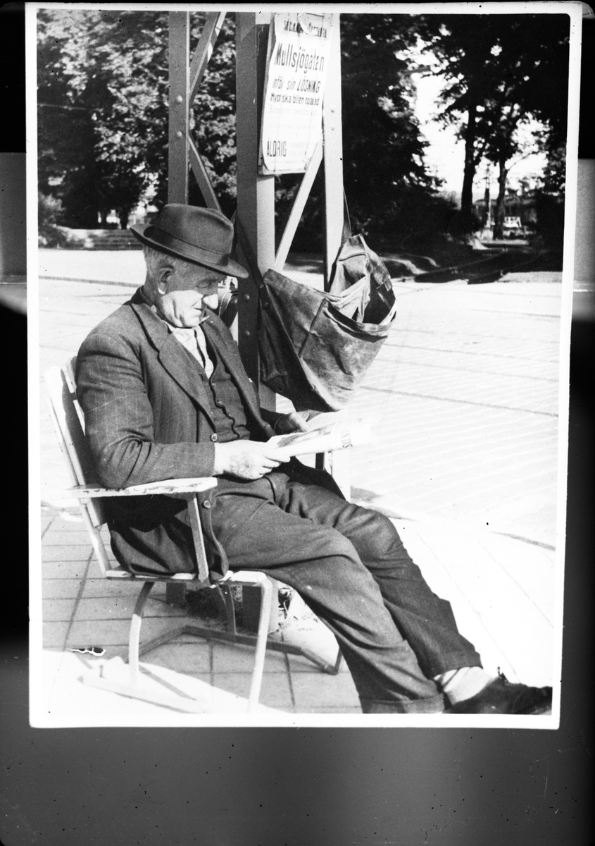 En tidningsförsäljare läser tidningen Smålands Allahanda bredvid en löpsedel med texten "Mullsjögatan inför sin lösning".
