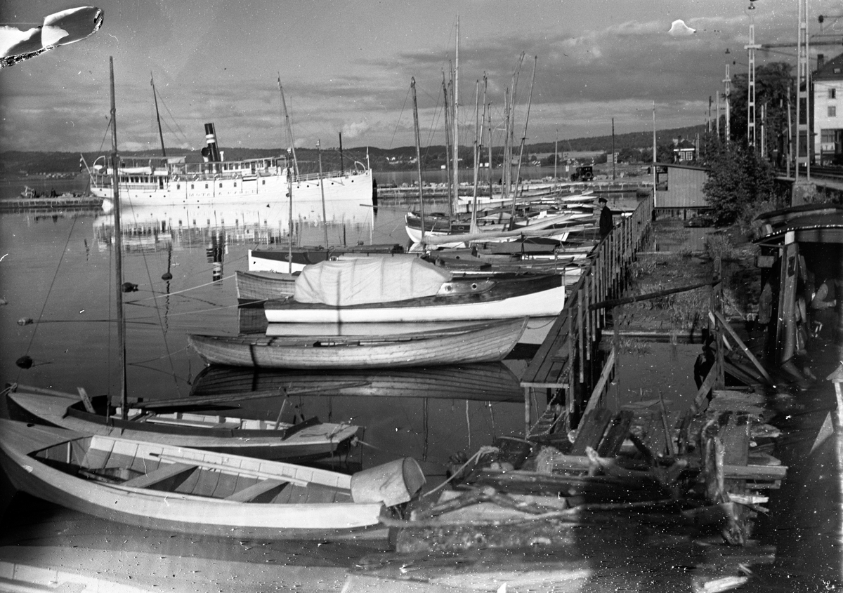 Småbåtar i Jönköpings hamn tillsammans med Motala Express längst bort.