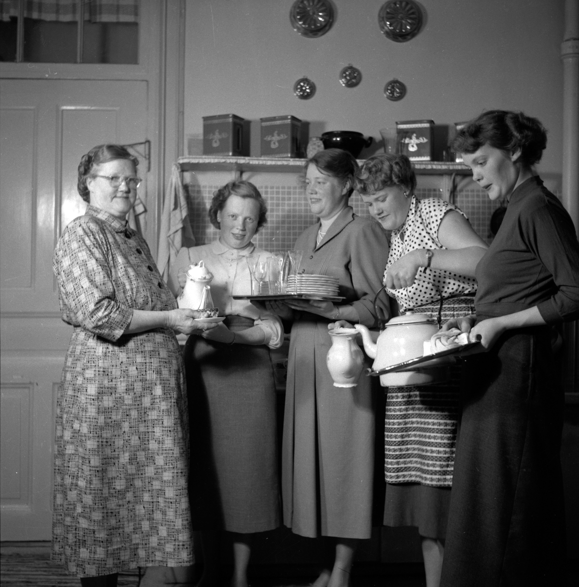 Fest hos familjen Karl Andersson i Järnvägshuset på Kapellgatan 6 i Jönköping. I köket står några kvinnor med porslin på brickor och kaffekannor. Från vänster: Anna, Eivor, Margit, Ingvor och sonhustrun Britt Lindberg.