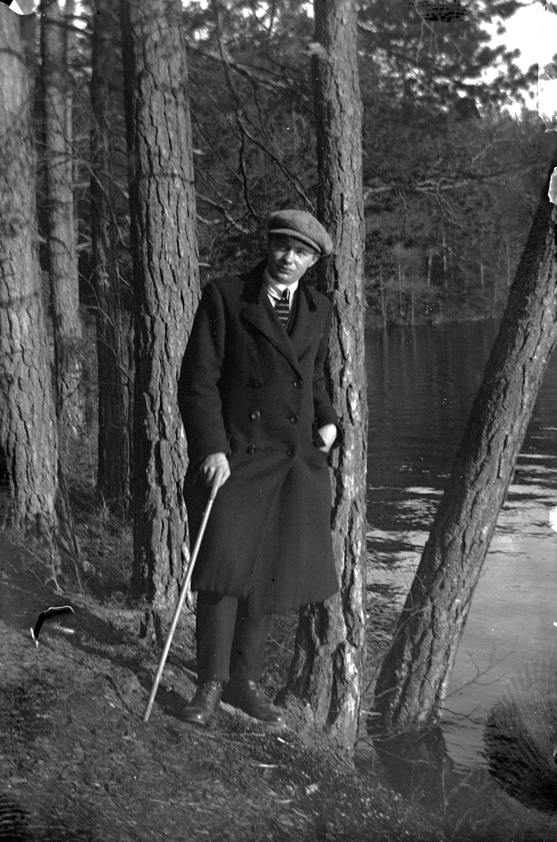 Gustav Andersson med käpp i handen på promenad i barrskogen.
