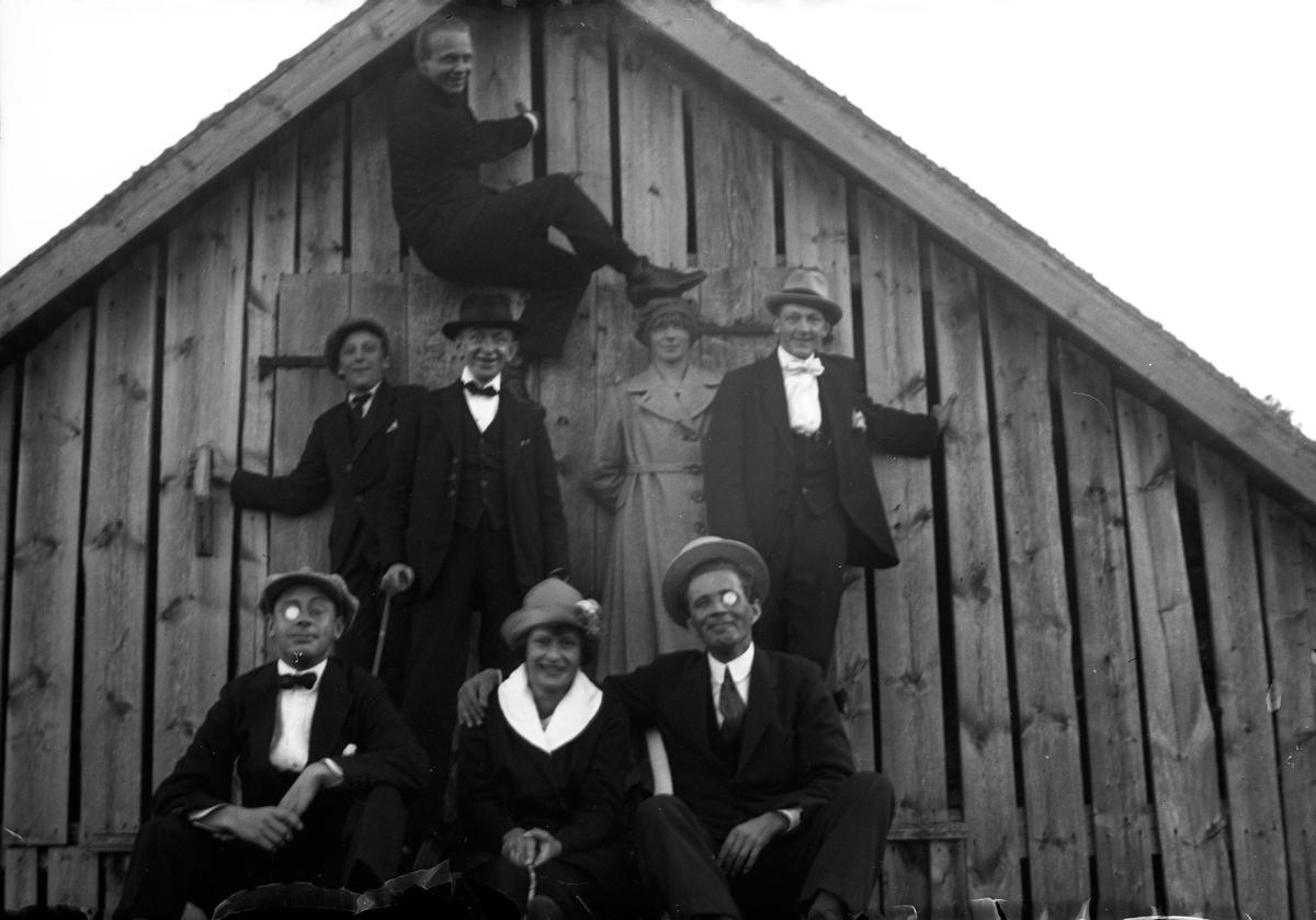 Åtta personer framför en husgavel av trä. Fotografens anmärkning: Gruppbild mossen.