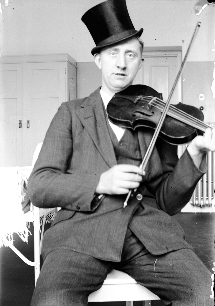 En man i hög hatt sitter på en stol och spelar fiol i ett rum på Eksjö Lungklinik.