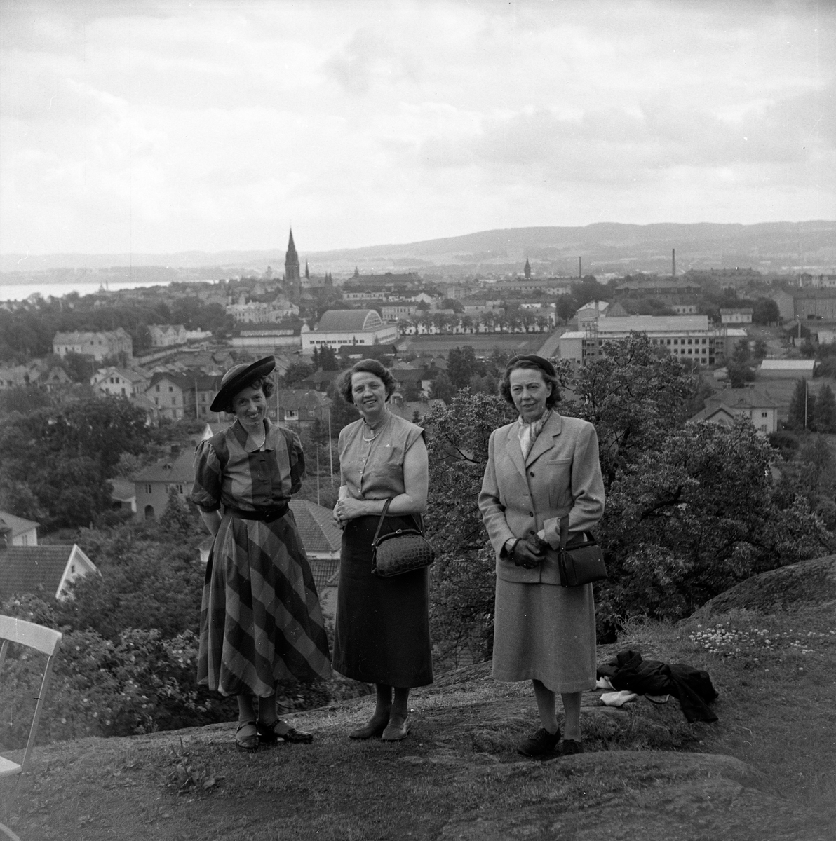 Fru Björklund med väninnor på Kanonberget i Jönköpings Stadspark. I bakgrunden syns bland annat Tennishallen, Idrottshuset och den ännu inte färdigbyggda Flickskolan.