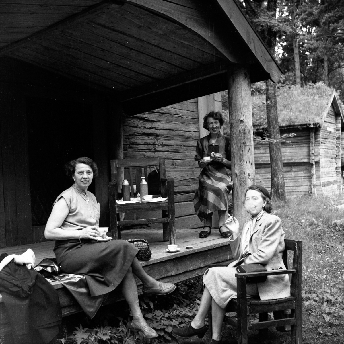 Kaffepaus utanför Sockenmagasinet i Jönköpings stadspark. I mitten står Margareta Björklund.