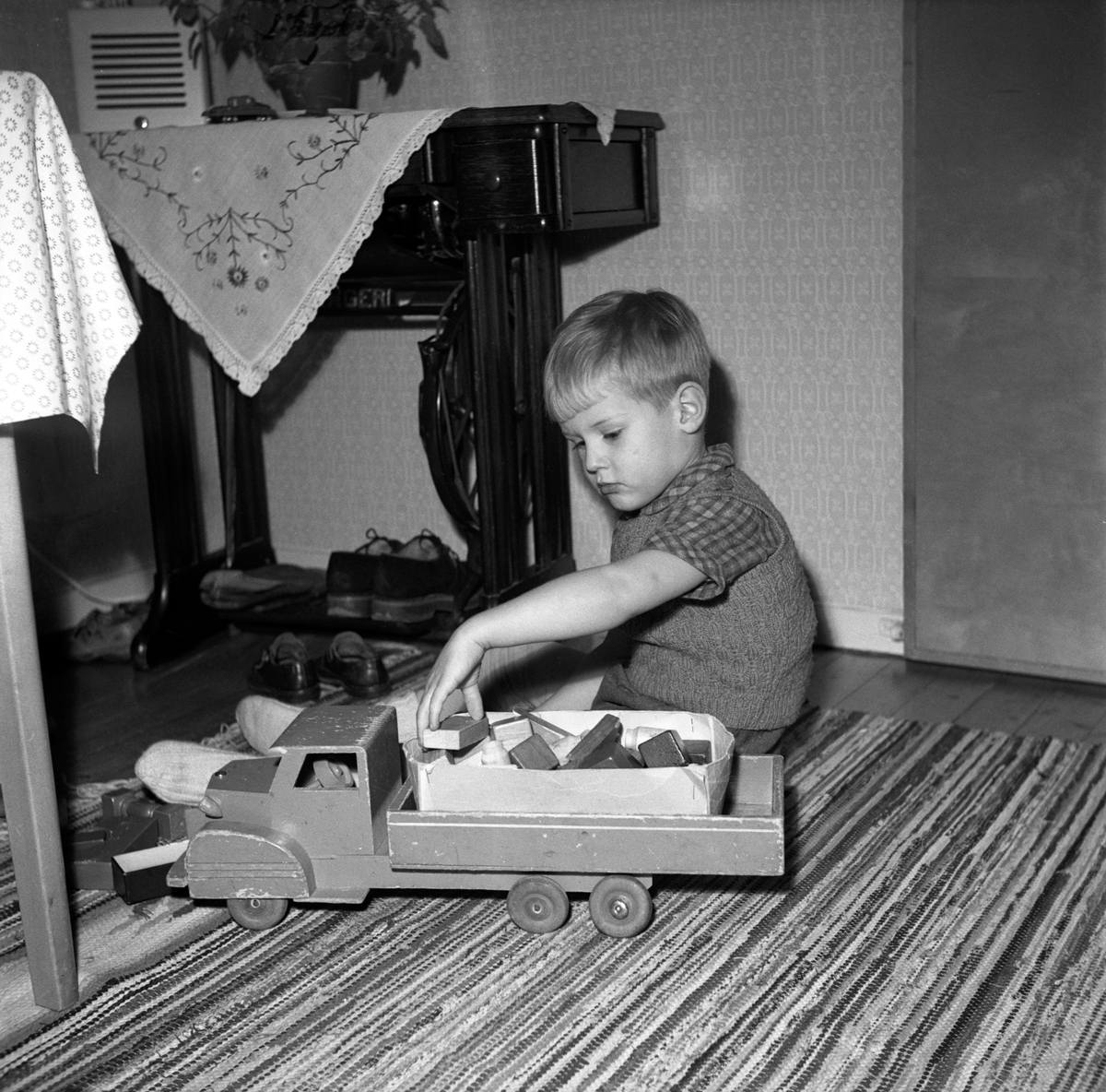 Pojken Bengt Damgren i Jönköping leker med en lastbil och klossar av trä.