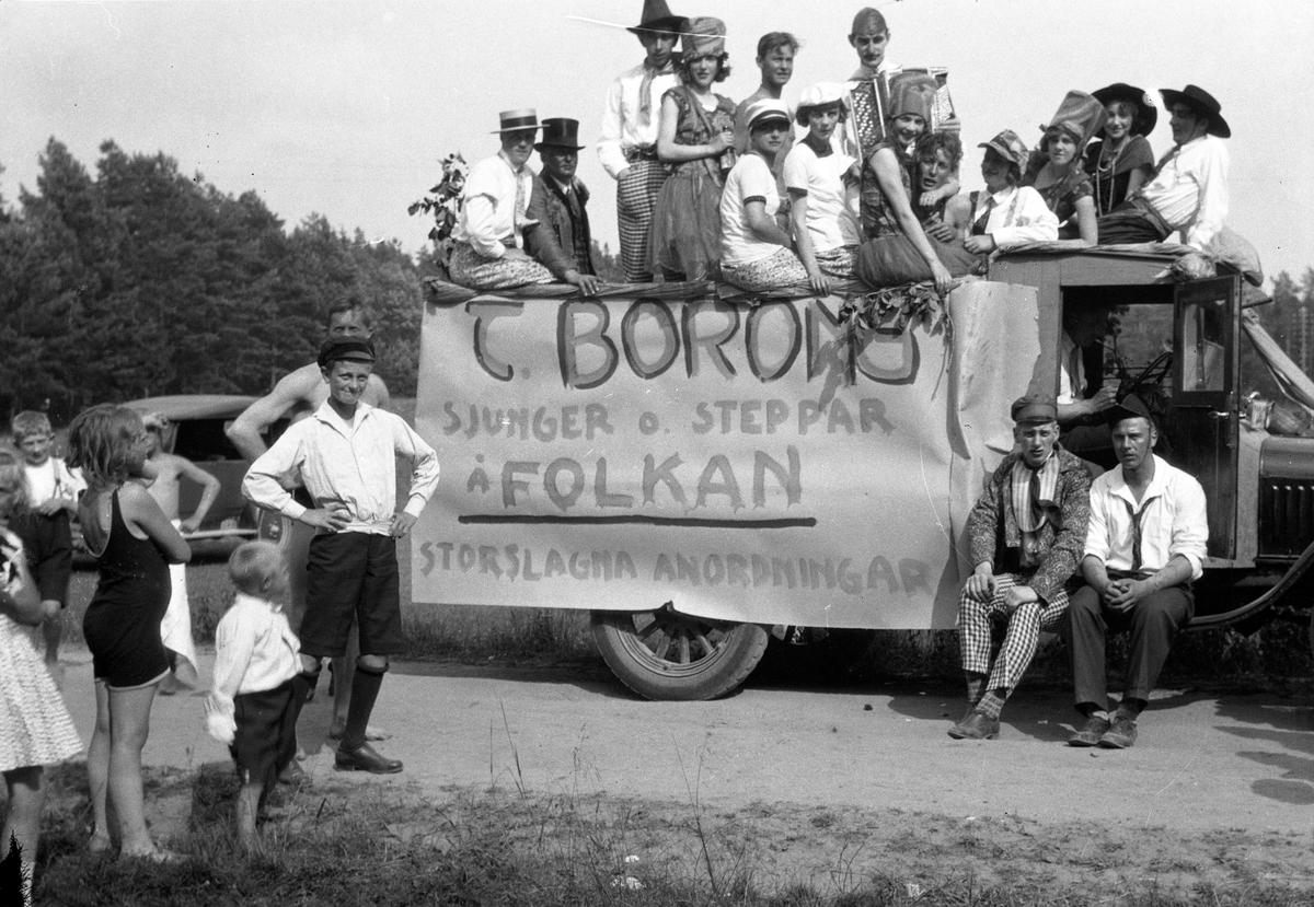 En lastbil med utklädda människor på flaket. På sidan sitter ett stort plakat med texten: T BORONG sjunger och steppar å Folkan, storslagna anordningar.