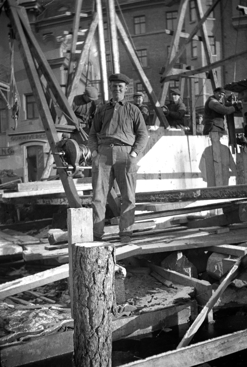 Kommunalarbetare Kalle Blom på en byggnadsplats framför Charles Gustafssons gummiverkstad vid Grönsakstorget i Jönköping.