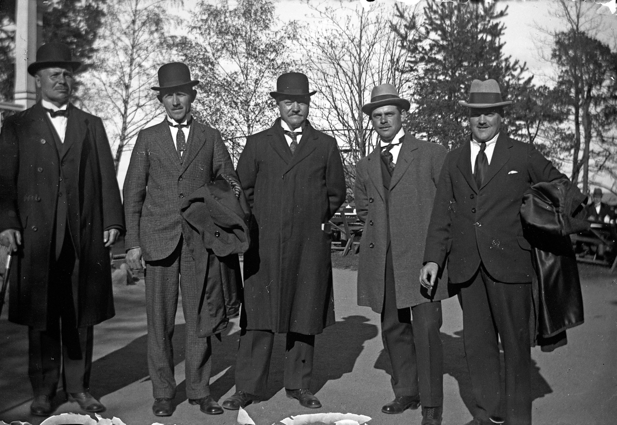 Fem män stående bredvid varandra. I bakgrunden syns träd, bord och stolar.