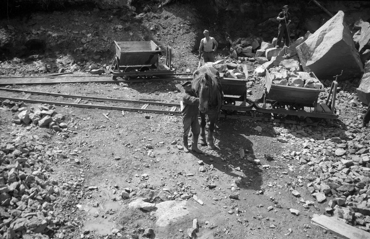 Ett stenbrott, Nubbstensberget i Mariebo utanför Jönköping. Järnvägsvagnar dragna av hästar forslar bort stenen.