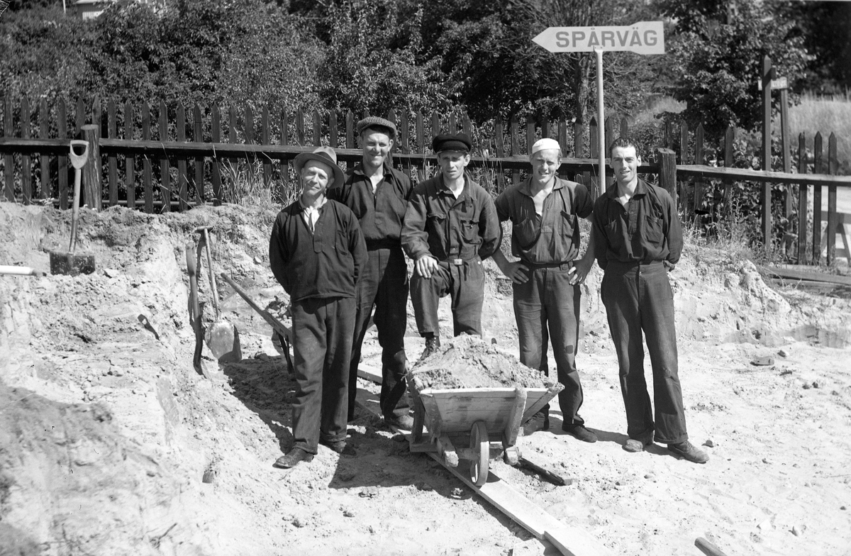 Jord körs bort i en skottkärra av trä på utlagda brädor. Bakom de fem männen finns en skylt som en pil med "SPÅRVÄG" på.