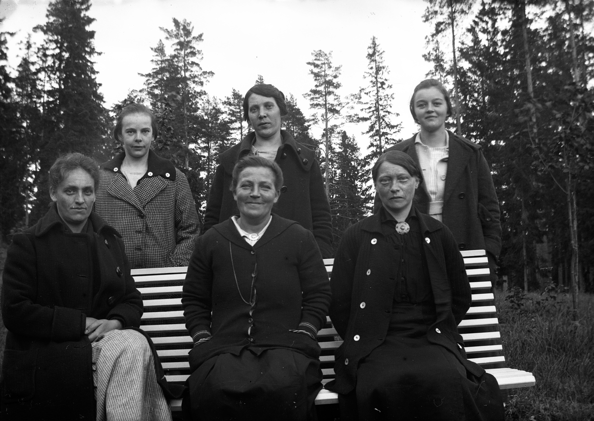 Sex kvinnor varav tre sittande på en bänk och tre stående bakom, mot barrskogsbakgrund. Fotografens anmärkning. "Gruppbild med käringar".
