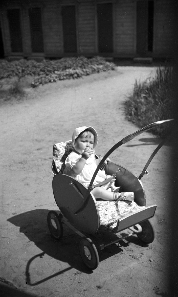 Ett litet barn i sin sittvagn vid "Bostäderna" i Jönköping.