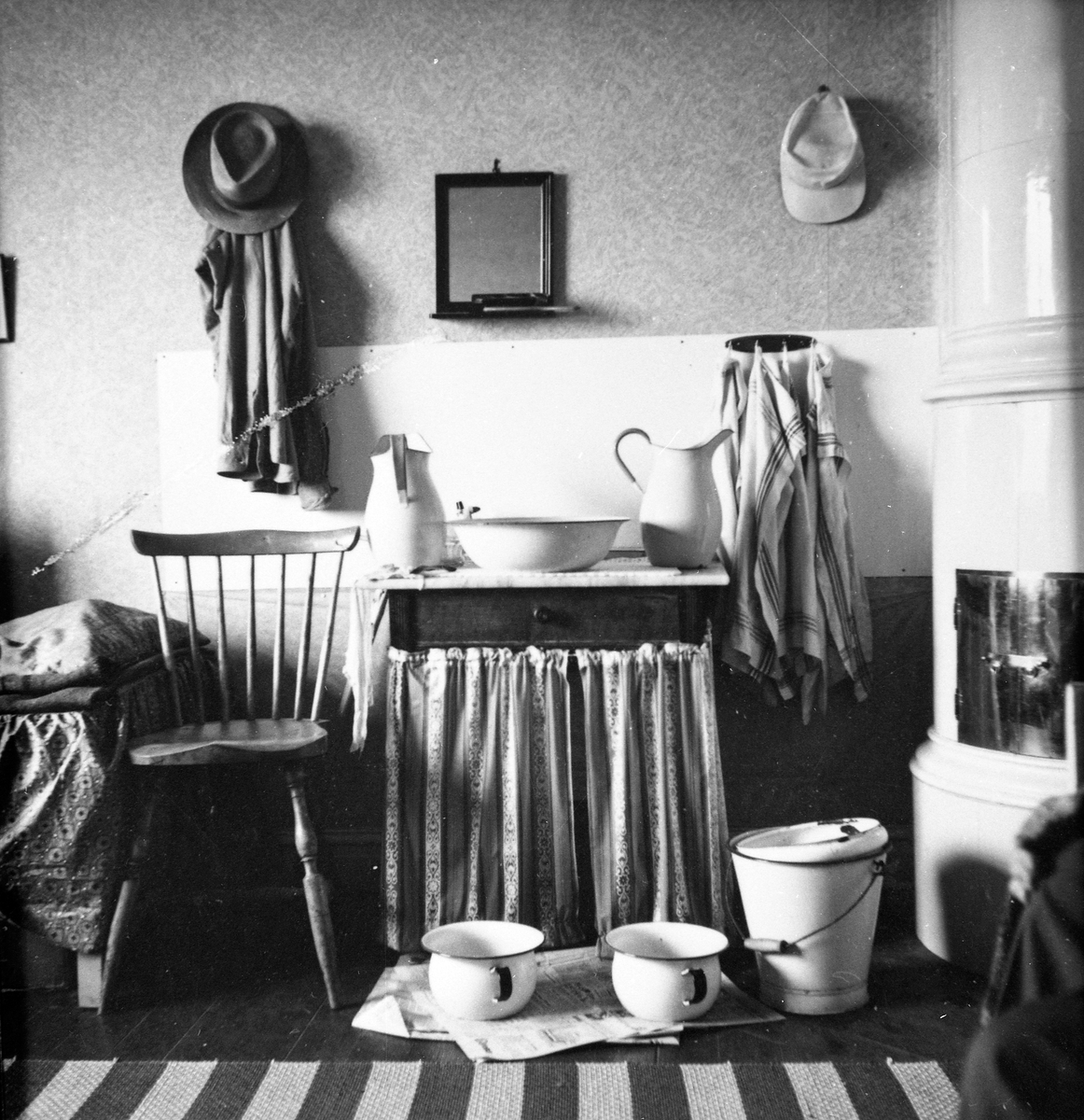 Gammal hygieninteriör från en lägenhet i Jönköping. Handfat med handkanna, spillvattenspann och två pottor.