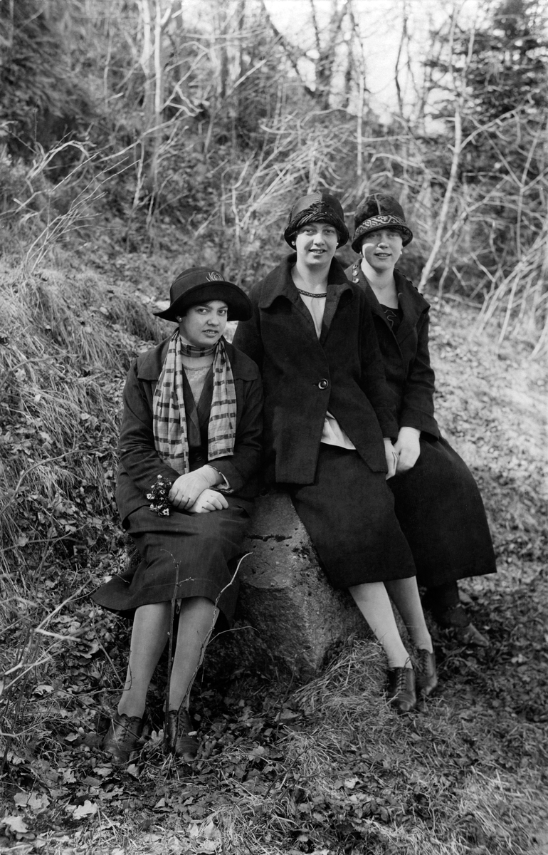 Porträtt av tre unga kvinnor i en skogsbacke.