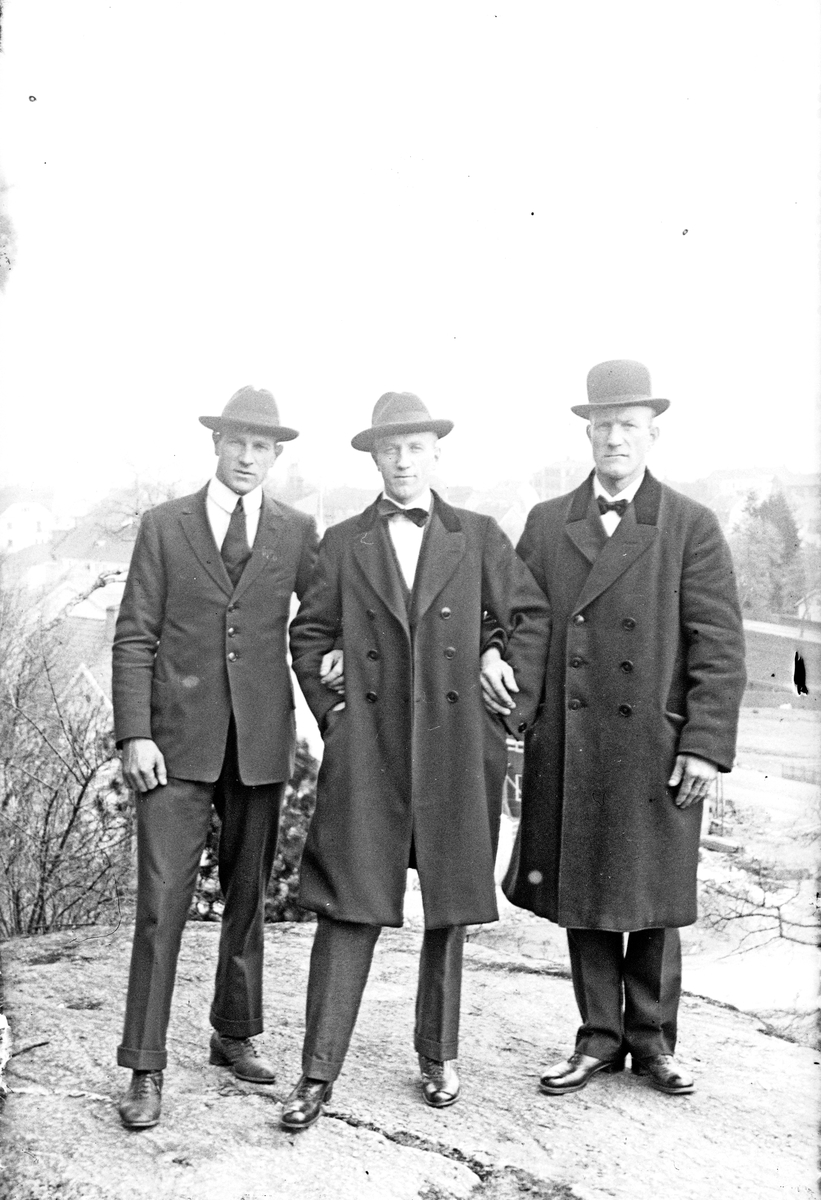 Tre män står uppställda för fotografering med Jönköping i bakgrunden.